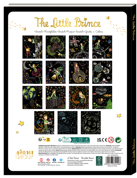 The Little Prince Scratch Book is a magical art activity for children aged 3 and up, featuring 15 beautifully illustrated scratch scenes inspired by The Little Prince. With just the included wooden stylus, kids can scratch away the black surface to reveal colorful cosmic and storybook designs underneath. The book-style format makes it easy to use and perfect for travel or quiet time. It encourages creativity, concentration, hand control, and imaginative exploration all in one enchanting and mess free set.